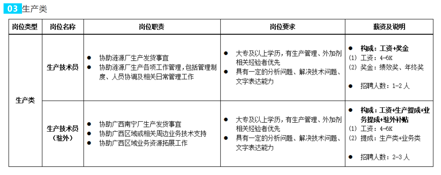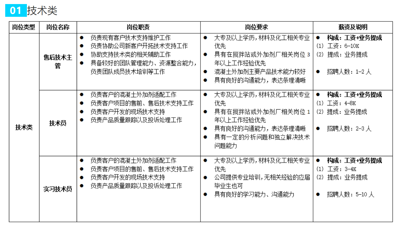 了解路祥 公司在不斷的壯大過程中,由當(dāng)初的一個廠發(fā)展成在湖南長沙、廣西南寧、貴州貴陽、云南安寧、重慶、新疆、甘肅均設(shè)立了分廠,由單一產(chǎn)品擴展的多個系列產(chǎn)品,外加劑系列產(chǎn)品年生產(chǎn)能力達到30萬噸以上。 湖南路祥正處于蓬勃成長階段,業(yè)務(wù)量呈爆發(fā)式增長趨勢,適逢公司發(fā)展良機,現(xiàn)有所列職位空缺,誠邀有識之士加入團隊,共筑美好未來。 1. 薪酬:按湖南路祥薪酬制度執(zhí)行。